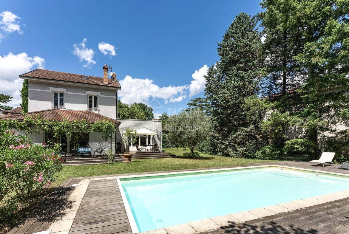 Tassin Bourg, au calme, situation idéale pour cette maison ancienne de 1900, d’environ 230m2 sur une parcelle de 1897 m2 avec piscine chauffée. Elle se compose d’une entrée avec placard, d’un salon, d’un séjour, d’une salle à manger donnant sur la terrasse et le parc, d’une grande cuisine équipée séparée, d’un WC séparé, d’un espace nuit avec la chambre parentale avec de nombreux placards et sa salle de bains, avec douche et WC suspendu. A l’étage un palier dessert 2 grandes chambres, une salle de douche, un WC séparé, un bureau avec sa salle de douche (poss chambre). Au 3ème niveau on retrouve une pièce/salle de jeu et une chambre. Un sous-sol avec buanderie, cave climatisée, pièce de rangement, ainsi qu’un garage simple et un local technique complètent ce bien. Extension possible.
