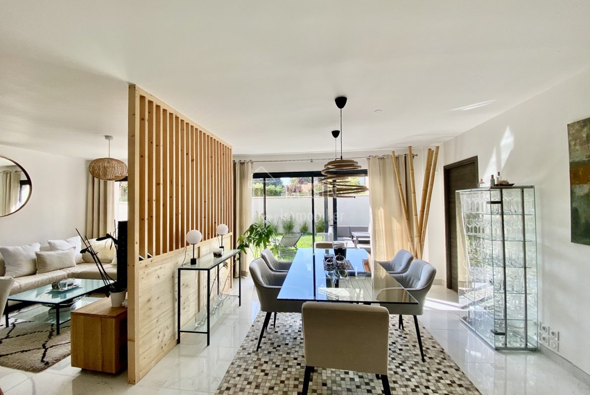 Proche Tassin, sur la commune de Saint Genis les Ollières, au calme, proche du centre et des bus, venez découvrir cette maison récente de 110m2 sur une parcelle de 230m2, 5 pièces, 3 chambres possibilité 4. Elle se compose d’une entrée, d’une belle pièce de vie lumineuse avec cuisine ouverte entièrement équipée de 41m2 donnant sur terrasse avec pergola et jardin, une chambre, une grande buanderie et un wc séparé. A l’étage un palier dessert 2 chambres, possibilité 3, dont une suite avec son dressing, sa salle de douche et sa terrasse privative et une salle de bains. Portail automatique et emplacement de stationnement. Belles prestations.
